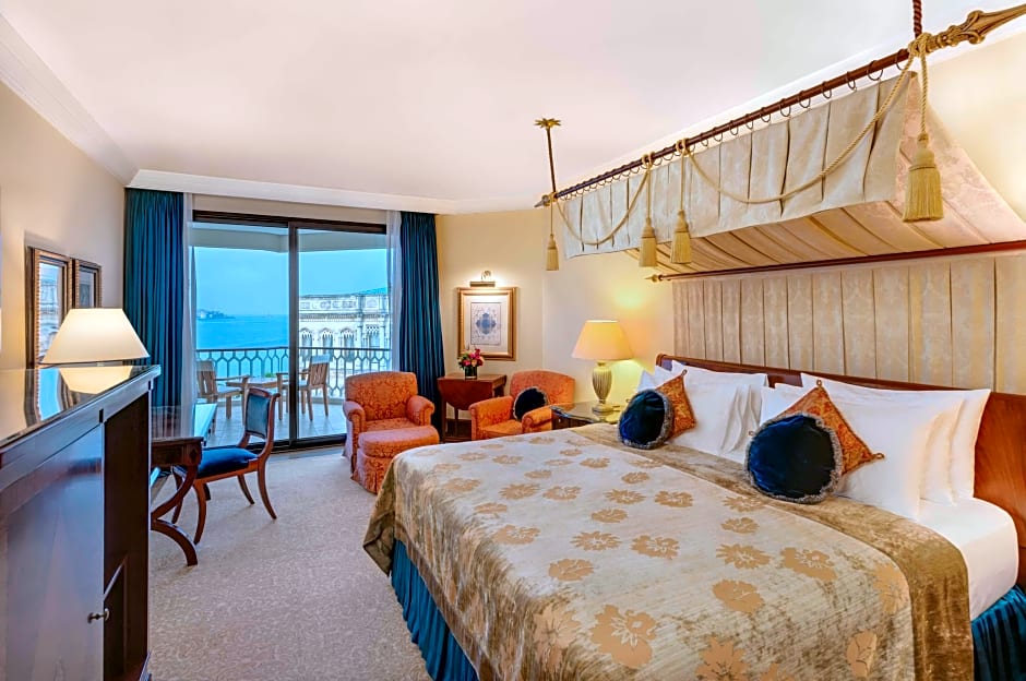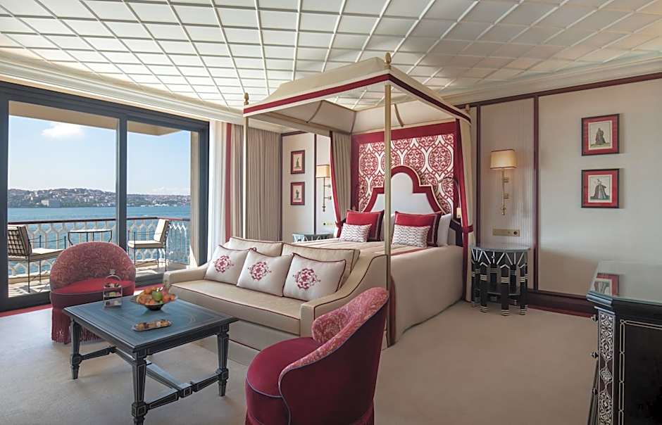 This room features a king bed or twin beds, a seating area and a bathroom. The balcony overlooks the Bosphorus and the interiors are inspired by Ottoman-era designs.